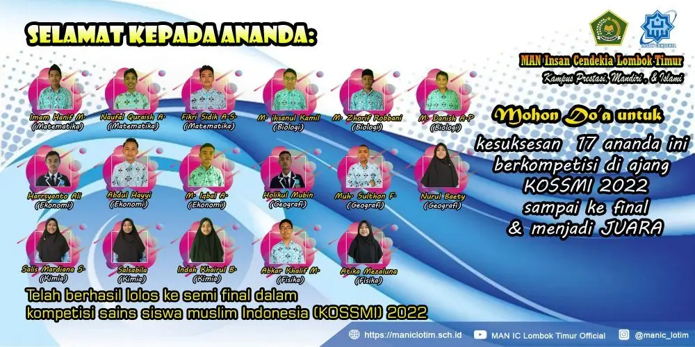 Di tahun 2022 ini, 30 peserta didik di MAN Insan Cendekia Lombok Timur berkesempatan untuk mengikuti Kompetisi berjenjang ini. Enam bidang lomba yaitu Matematika, Fisika, Kimia, Biologi, Ekonomi, dan Geografi masing-masing diikuti oleh 5 orang peserta didik. Pada tanggal 27 Februari lalu 30 Peserta didik ini mengikuti babak Penyisihan KOSSMI 2022 Secara Online dari Madrasah. Pengumuman hasil babak penyisihan dipublikasikan pada tanggal 16 Maret 2022. Berdasarkan pengumuman tersebut 17 dari 30 peserta didik MAN IC LOTIM berhak berkompetisi ke babak semi final. 17 peserta didik ini di antaranya 3 orang bidang Matematika, 2 orang bidang Fisika, 3 orang bidang Kimia, 3 orang bidang Biologi, 3 orang bidang Ekonomi, dan 3 orang bidang Geografi. Semi final akan dilaksanakan secara online juga pada tanggal 10 April 2022. Harapan seluruh civitas akademika MAN IC LOTIM tentu saja 17 peserta didik in bisa memeroleh hasil terbaik dan menjadi yang terbaik sampai di akhir kompetisi, Semoga diberikan kemudahan dan kelancaran oleh Allah Subhanahu wata’ala kepada seluruh ananda yang berhasil lolos dan berjuang di babak selanjutnya. Aamiin yaa mujibassa’ilin.
