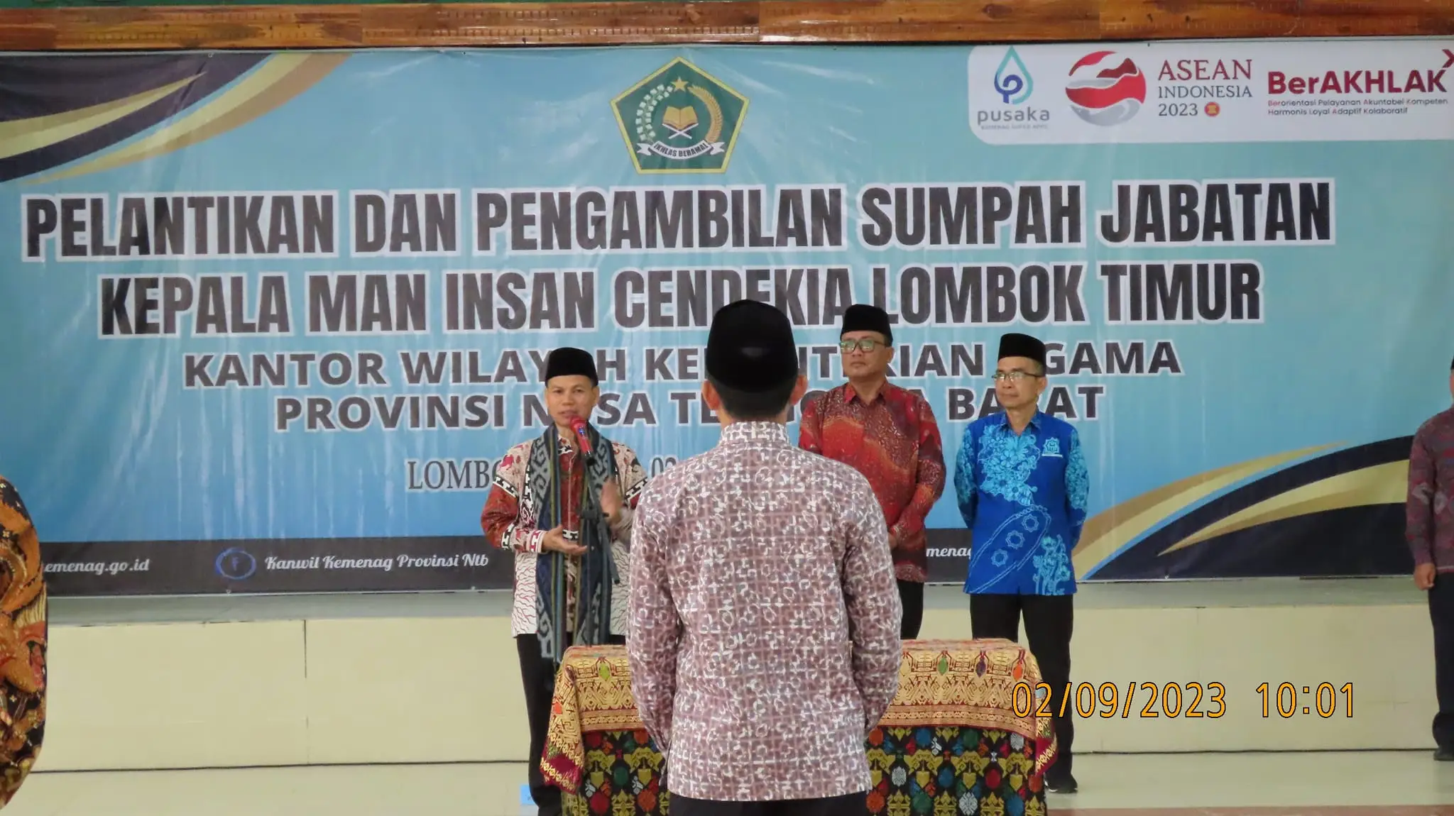 Pelantikan Kepala MAN Insan Cendekia Lombok Timur dilaksanakan pada hari ini, Sabtu tanggal 02 September 2023 jam 08.30 – 10.30 WITA, berlangsung di Gedung Pusat Pembelajaran Terpadu (GPPT) MAN IC Lombok Timur. Pada acara tersebut, Direktur Guru dan Tenaga Kependidikan Madrasah Direktorat Jenderal Pendidikan Islam Kementerian Agama RI, Dr. Muhammad Zain, M.Ag, berkenan melantik Kepala MAN IC Lombok Timur yang baru yaitu H. Nasruddin Mansyur, M.Pd.I. menggantikan Kepala Madrasah yang lama yaitu H. Aozar Zawad, M.Ed.